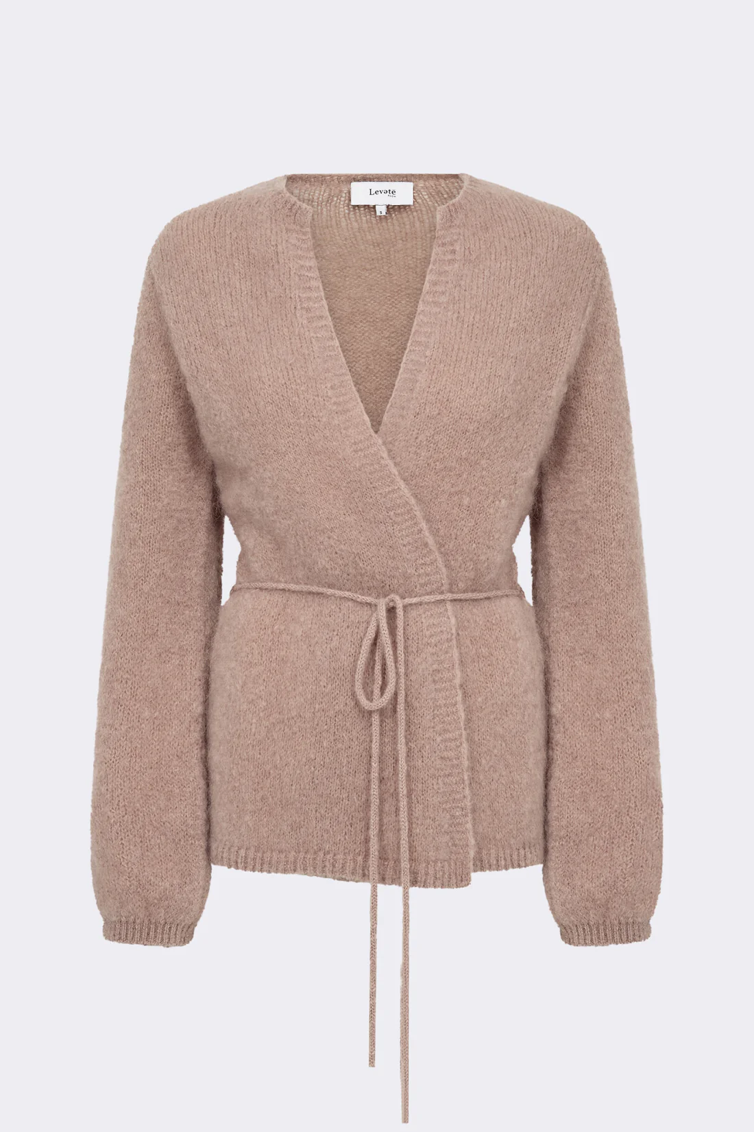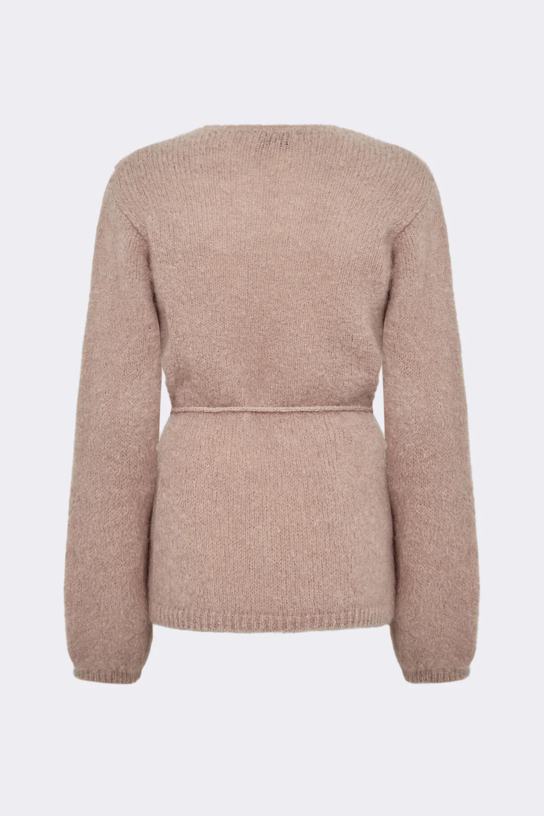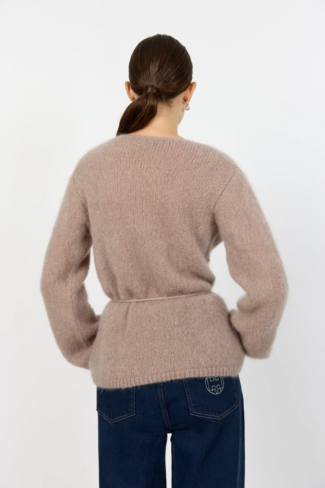 NOREEN 7 er en cardigan laget av 53 % mohair, 45 % polyamid og 2 % elastan. Denne elegante cardiganen har en klassisk V-hals, knyting i midjen og lange ermer med myk tekstur. Kombiner den med skreddersydde bukser for et kult og sofistikert utseende.