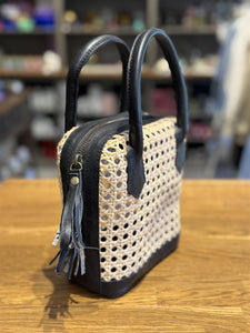 Veske fra By TAC i skinn og rotting - håndlaget på Bali. Mål: 19 x 19 cm. pluss hank, bunnen er ca 8 cm. dyp.