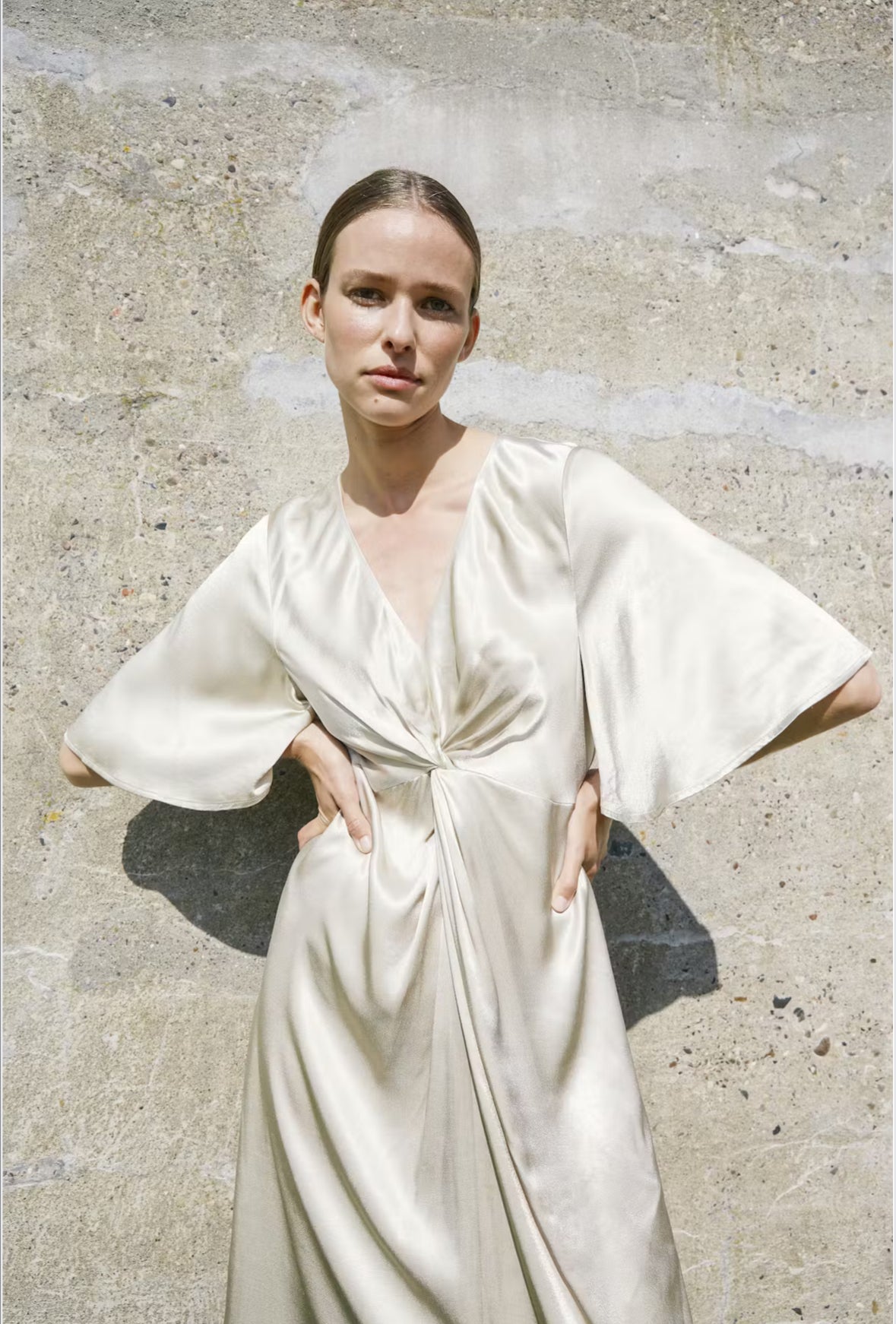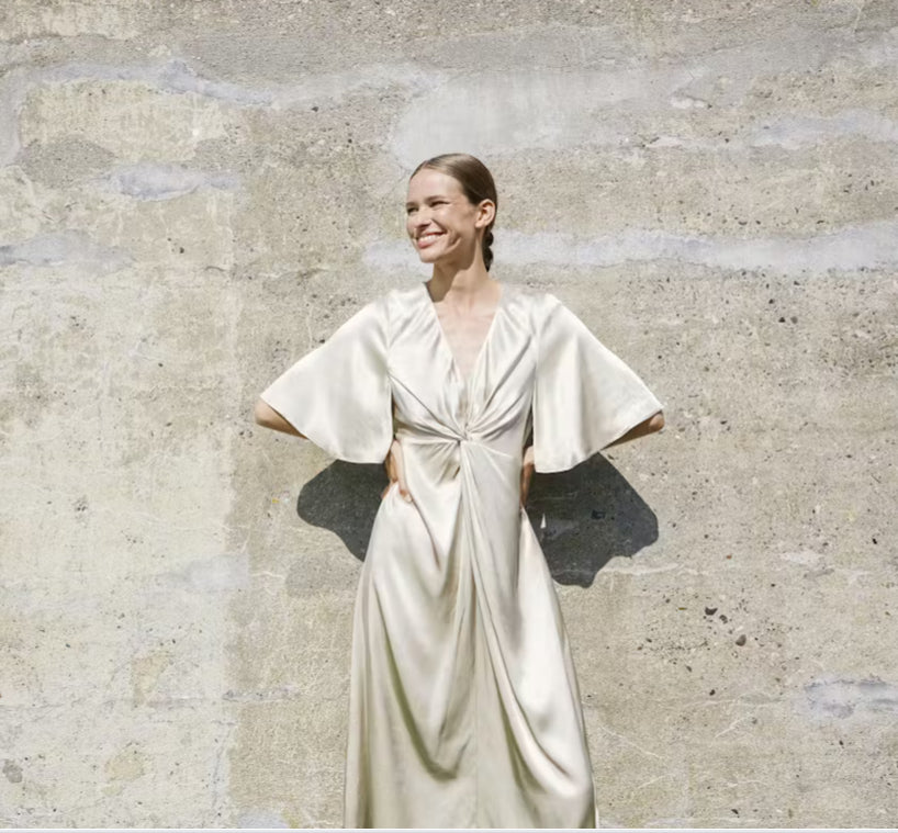 Elegant midikjole med en flatterende v-hals og sommerfuglermer. Den draperte knutedetaljen foran gir et sofistikert uttrykk. Perfekt til festlige anledninger med sin lette glans og feminine silhuett. Modellen er 176 cm høy og har på seg størrelse M.