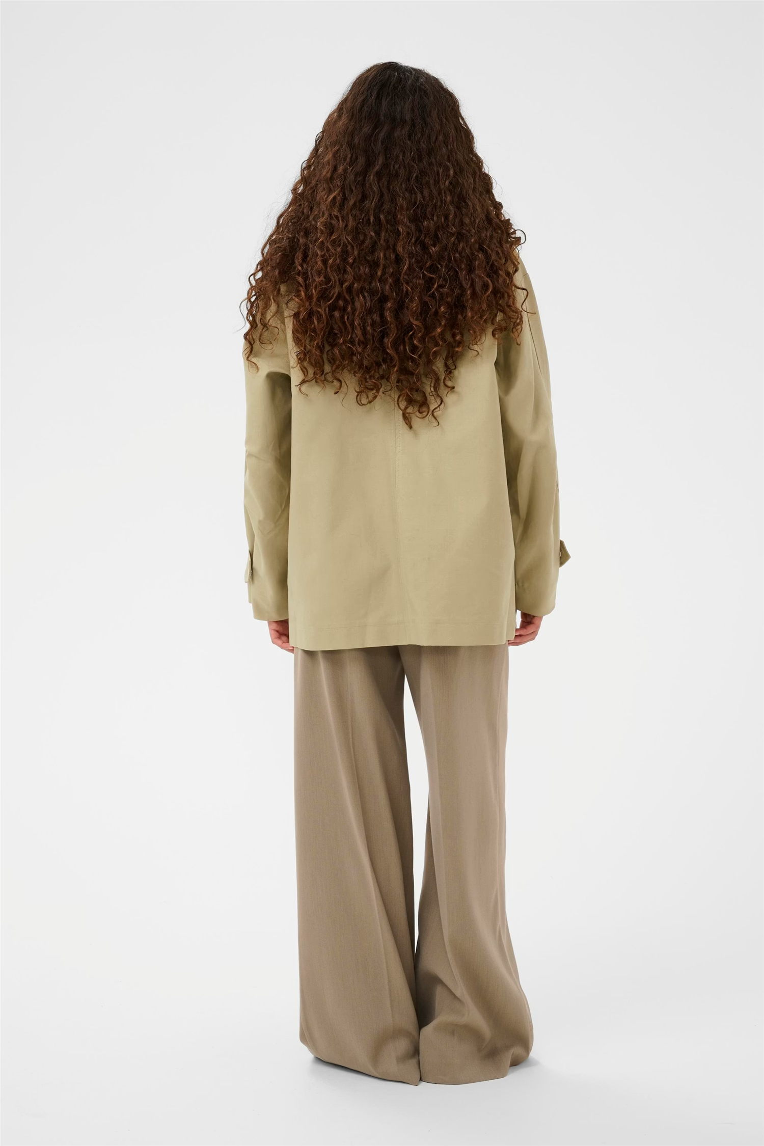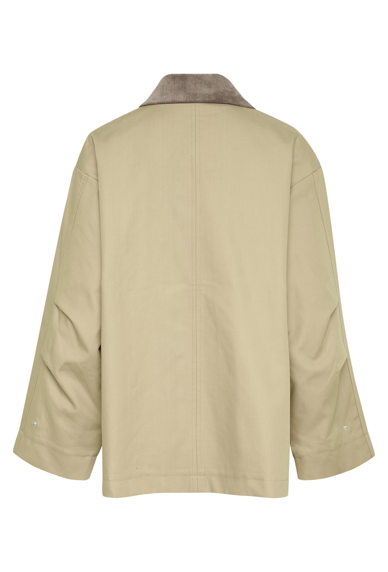 Oversized jakke med strukturert silhuett og kontrastkrage. Skjult front, brede ermer med knapp og to store frontlommer gir et raffinert uttrykk.