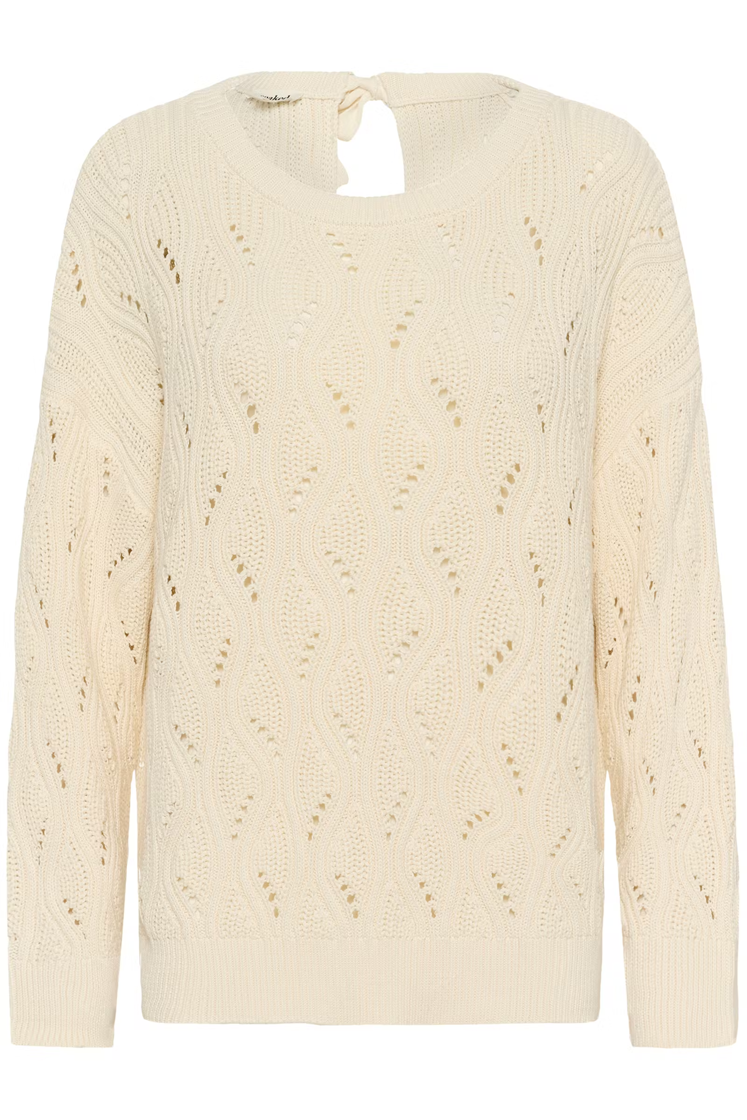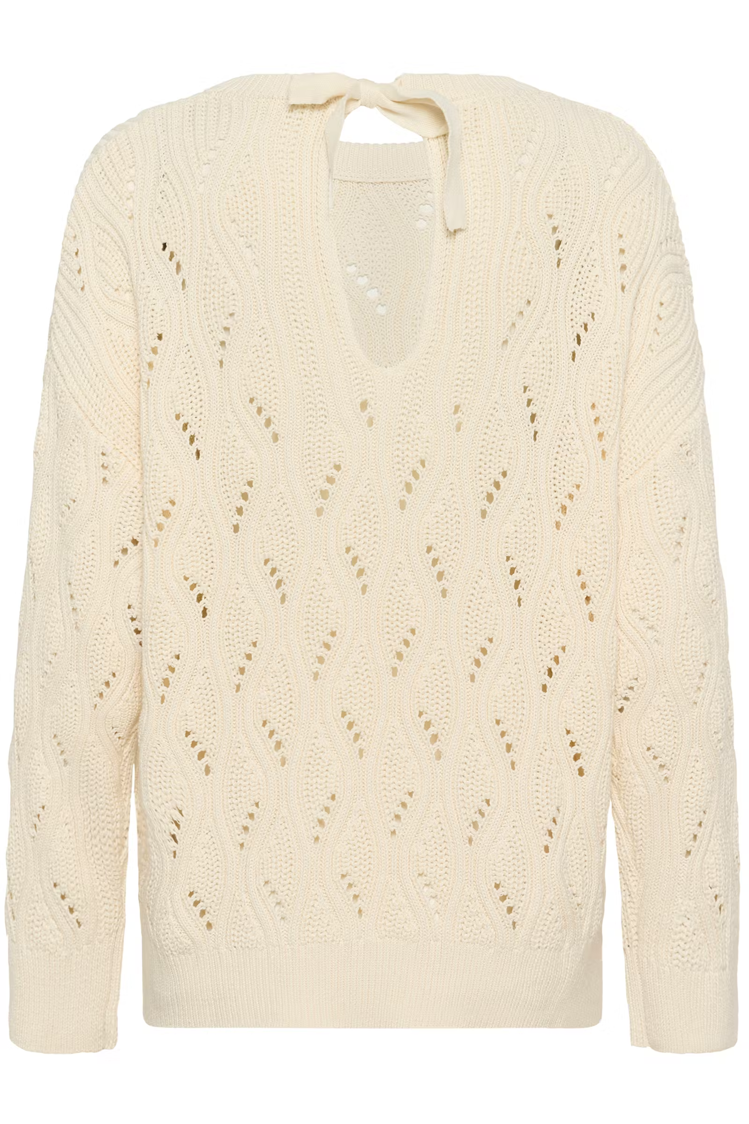 Strikket genser med bølget hullmønster, rett og avslappet passform og rund hals. Lange ermer, ribbet kant og knyteåpning bak.
