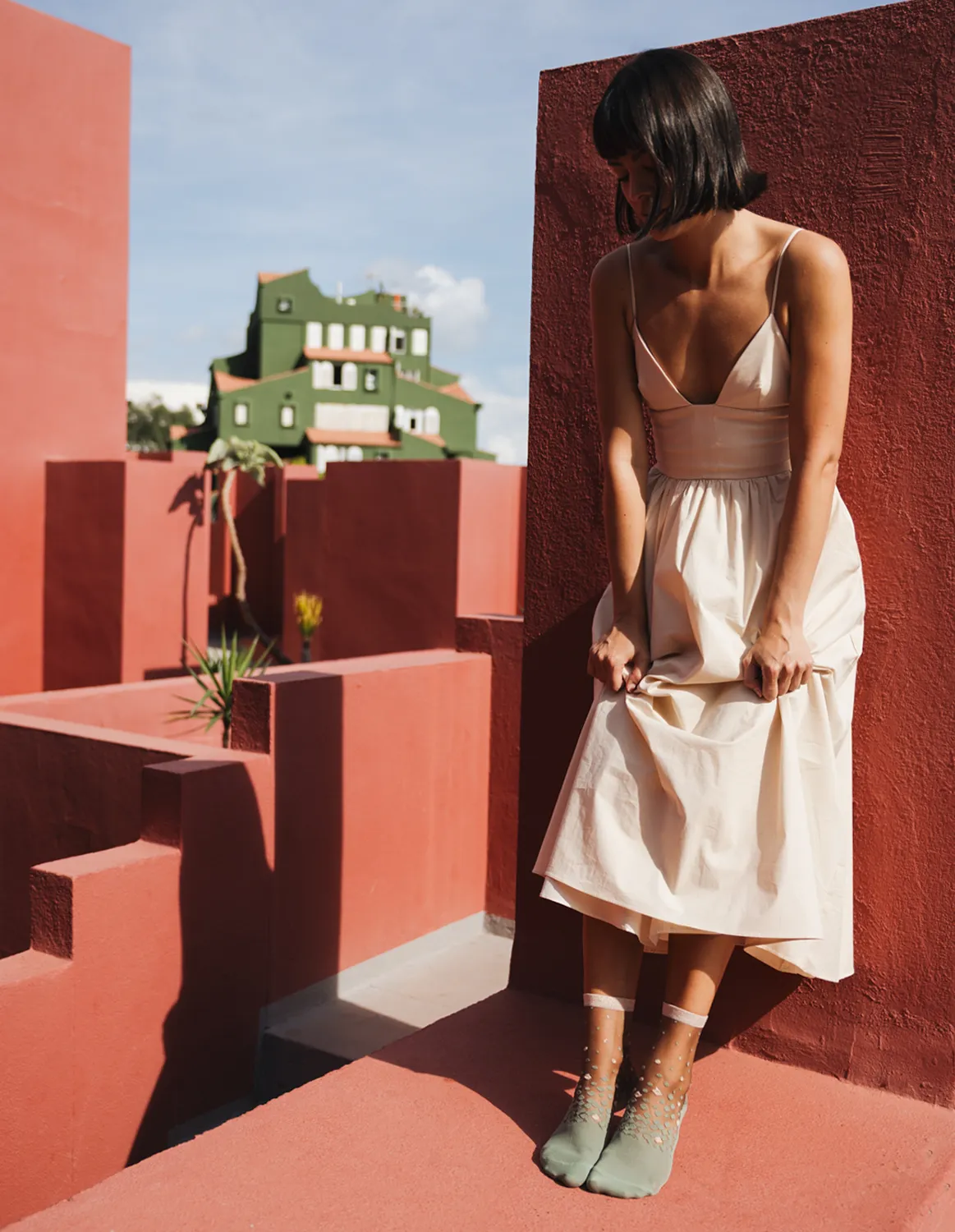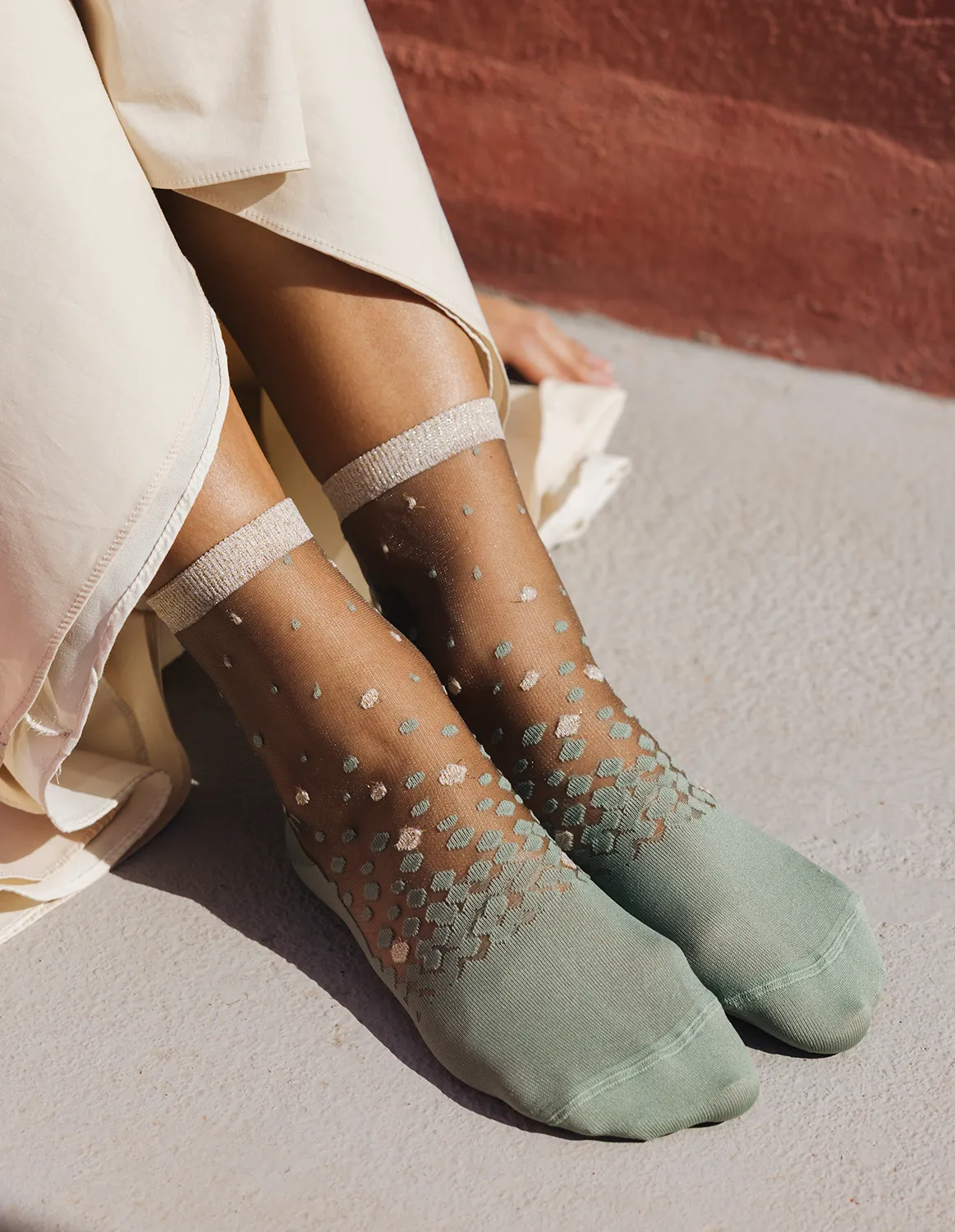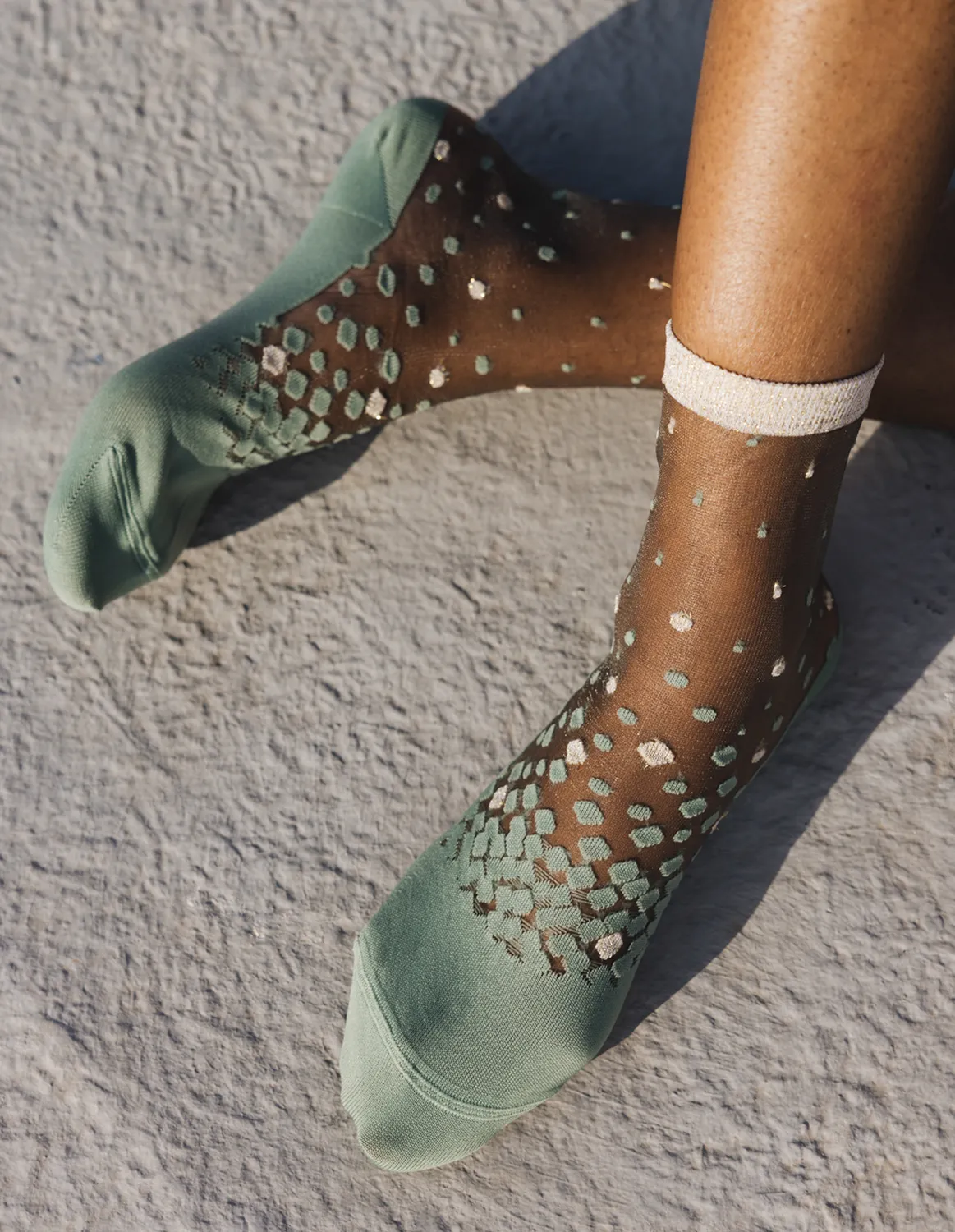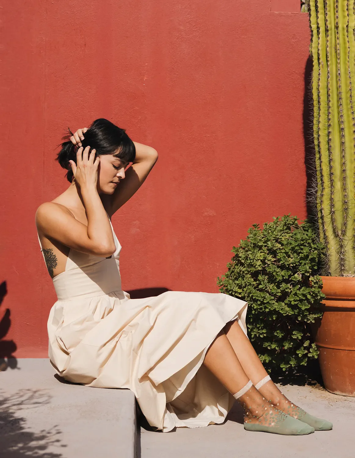 Gjenopplev NakaMeguro, vårt ikoniske par, i en ny farge som er ideell for sommeren: salviegrønn. Inspirert av kirsebærblomstbladene i Nakameguro-kanalen, vil disse sokkene passe perfekt til en sommerkjole eller linbukser.