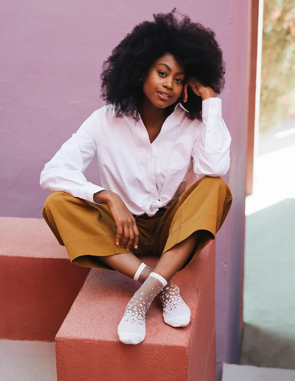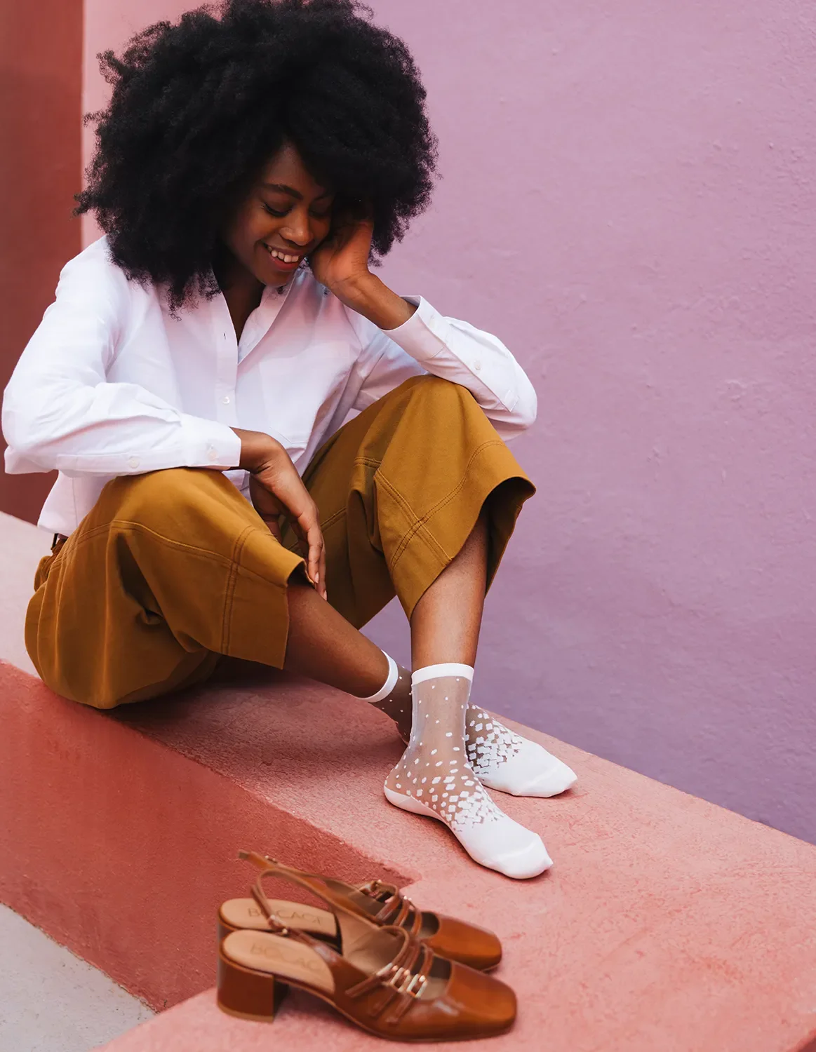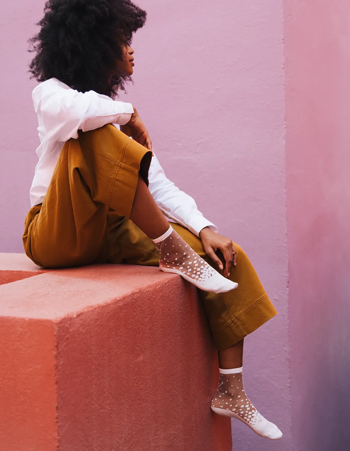 Gradient av hvite polkaprikker på en gjennomsiktig bakgrunn: den klassiske plumetisen gjenopplevd. Ideell med joggesko så vel som til bryllupsantrekket ditt! Inspirert av de kirsebærblomstrende kronbladene som flyr i Nakameguro-kanalen.