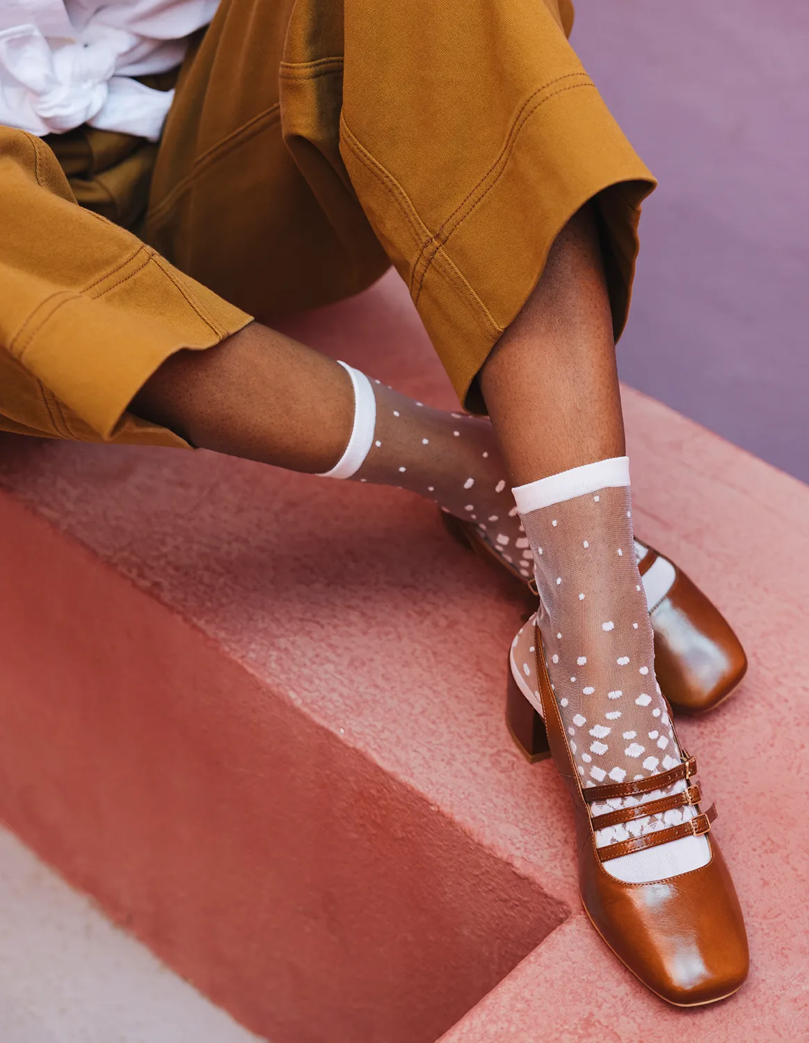 Gradient av hvite polkaprikker på en gjennomsiktig bakgrunn: de klassiske plumetisene gjenoppdaget. Ideell med joggesko så vel som til bryllupsantrekket ditt! Inspirert av kirsebærblomstrende kronblader på Nakameguro-kanalen.