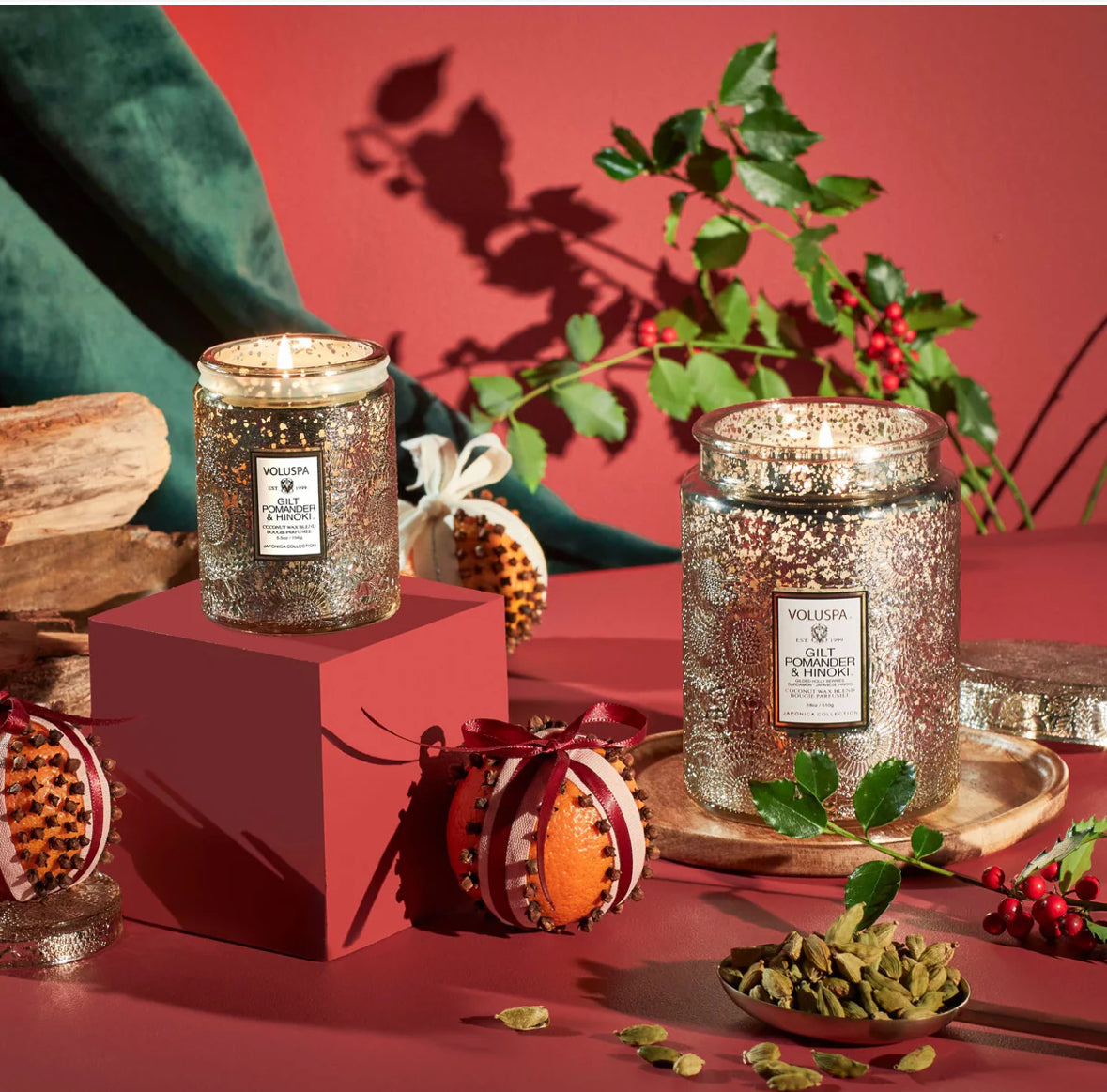 Notes of Golden Spiced Pomander, Holly Berries, Cardamom & Japanese Hinoki Bark.