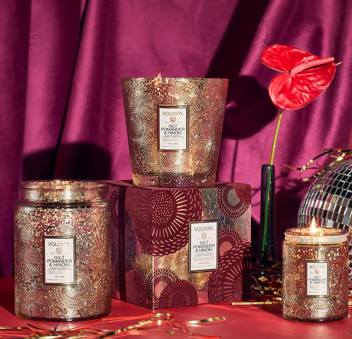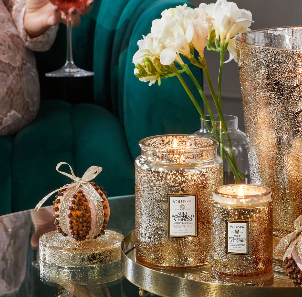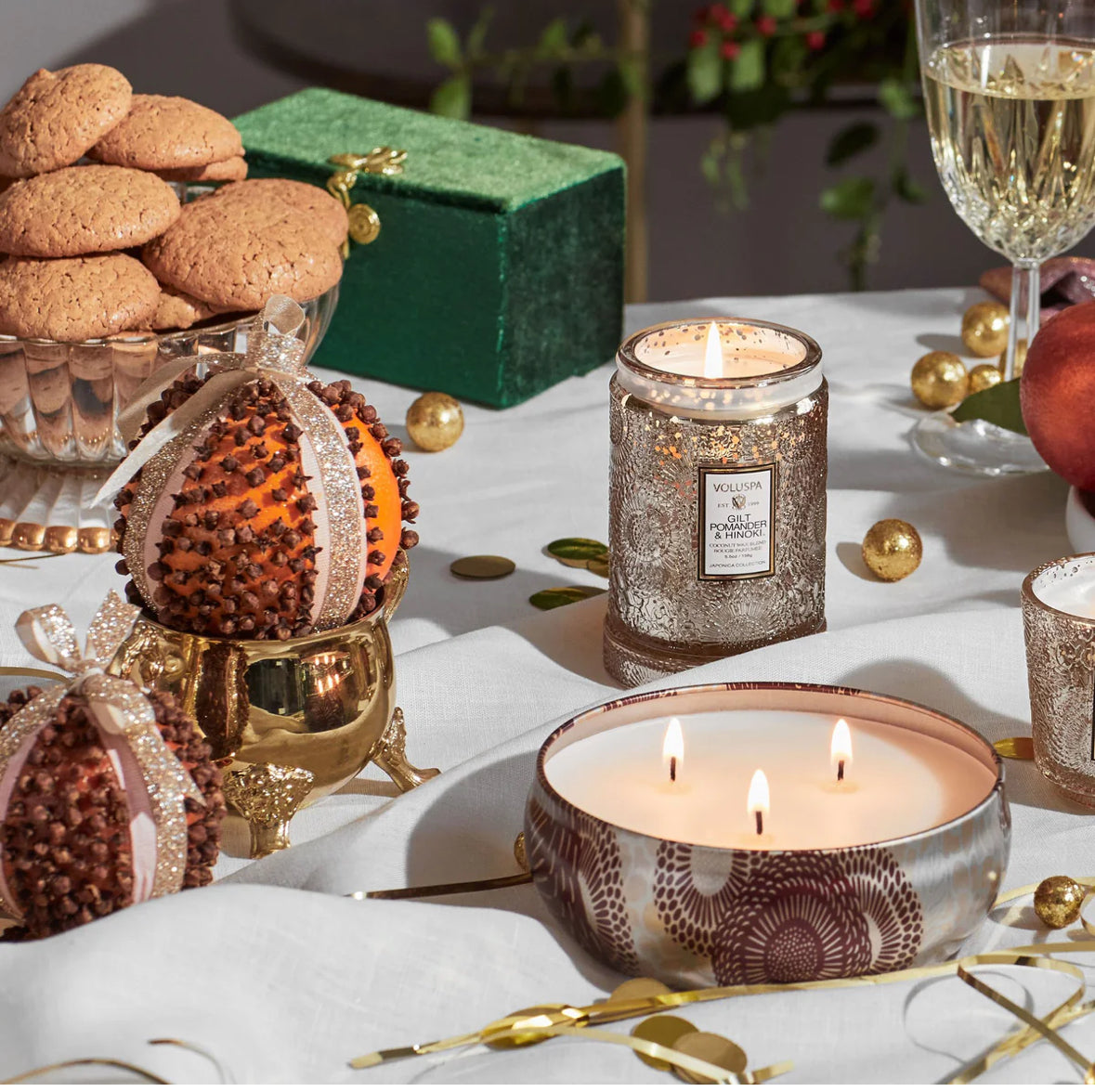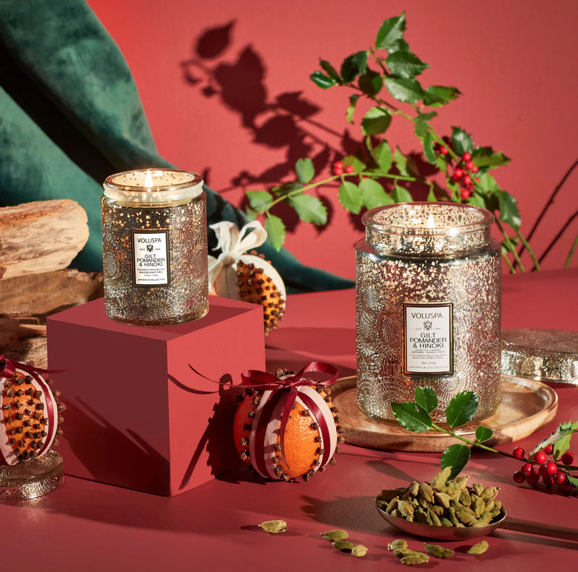 Notes of Golden Spiced Pomander, Holly Berries, Cardamom & Japanese Hinoki Bark.