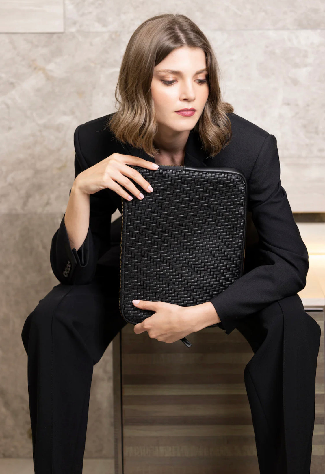 Computer case in beautiful braided vegan leather. Closed with gold colored zipper.